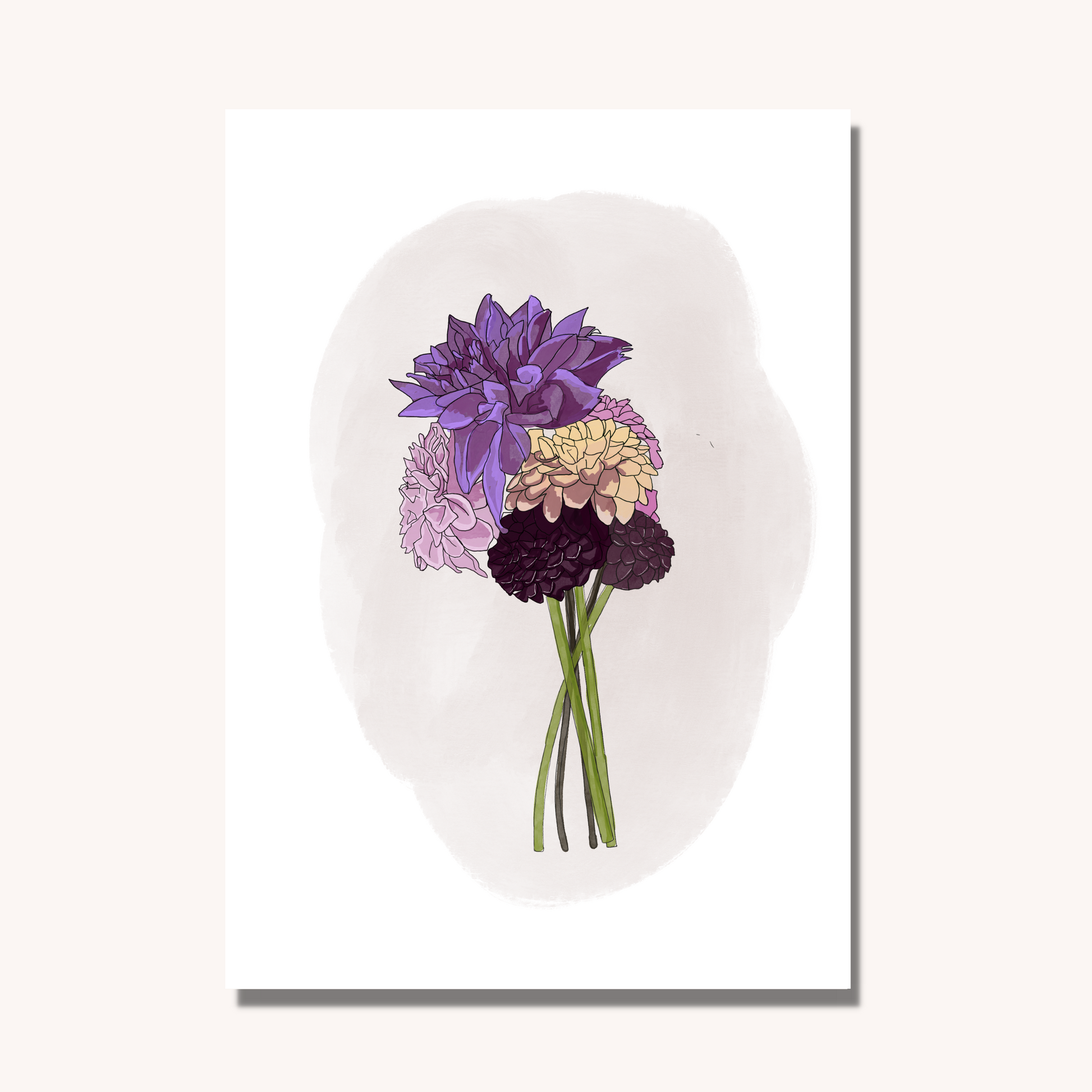 Hand-illustrated dahlia bouquet design in soft, natural tones