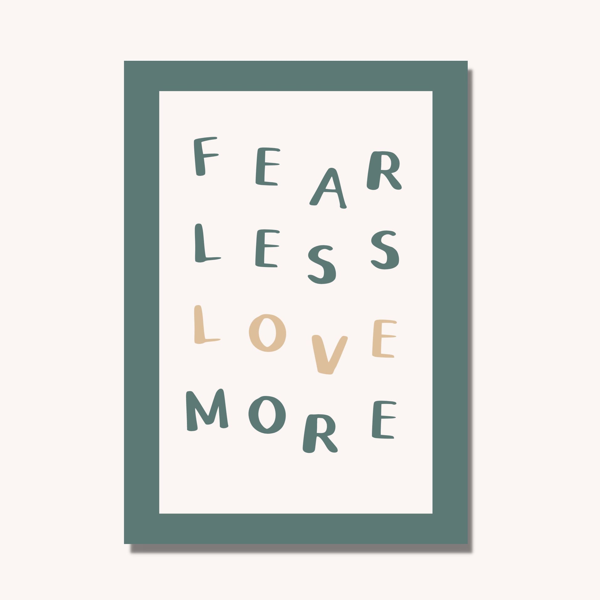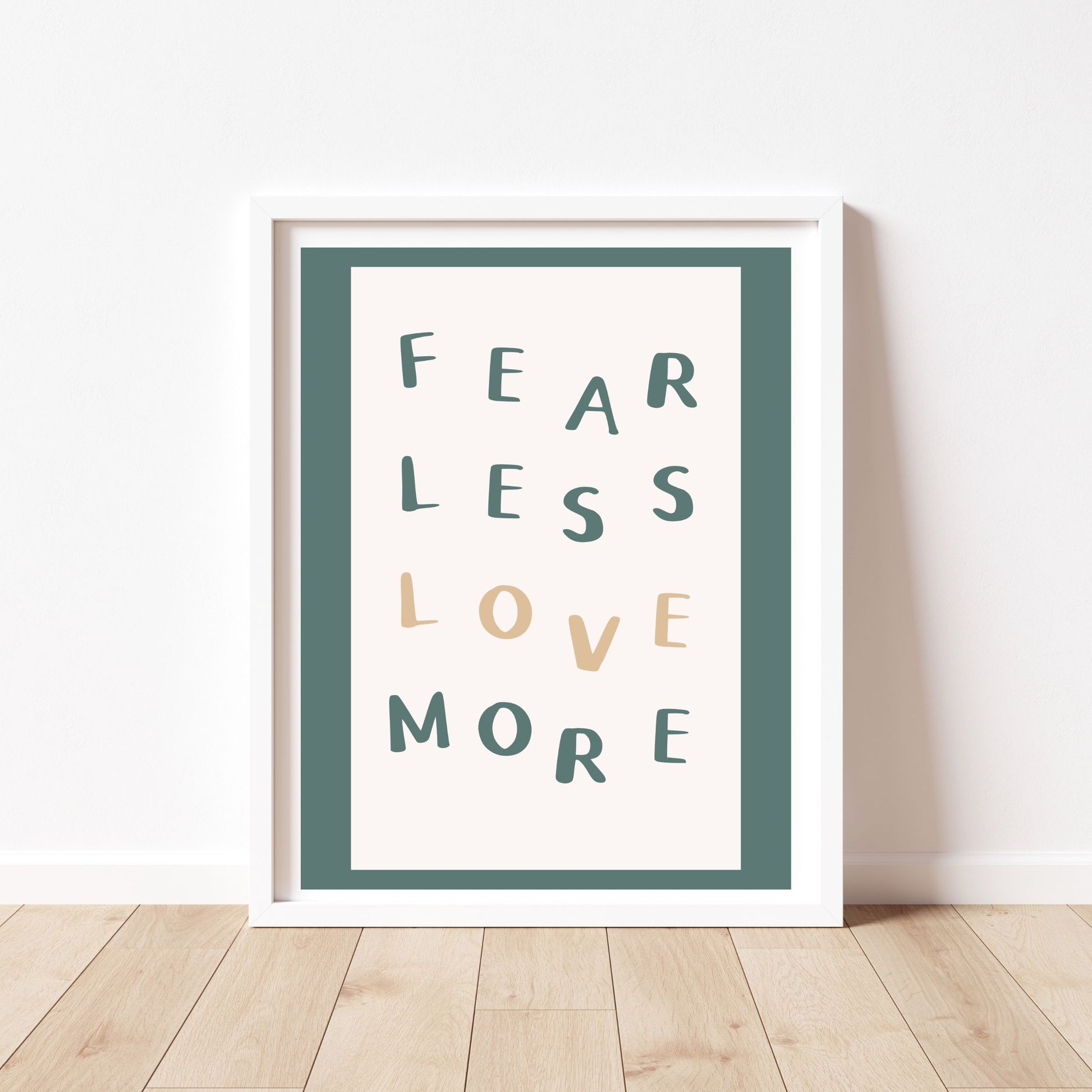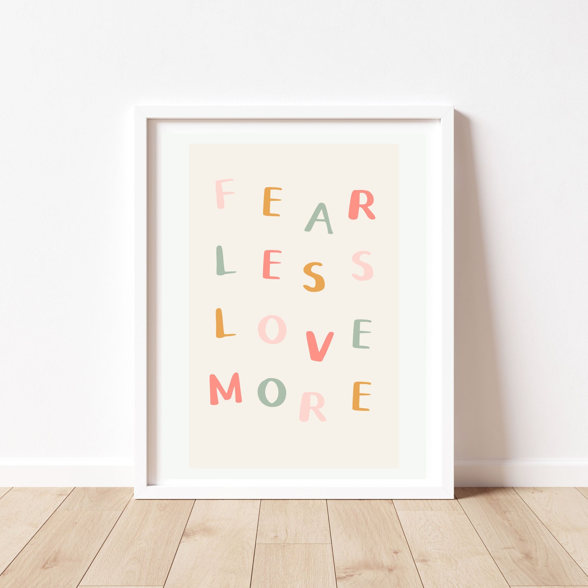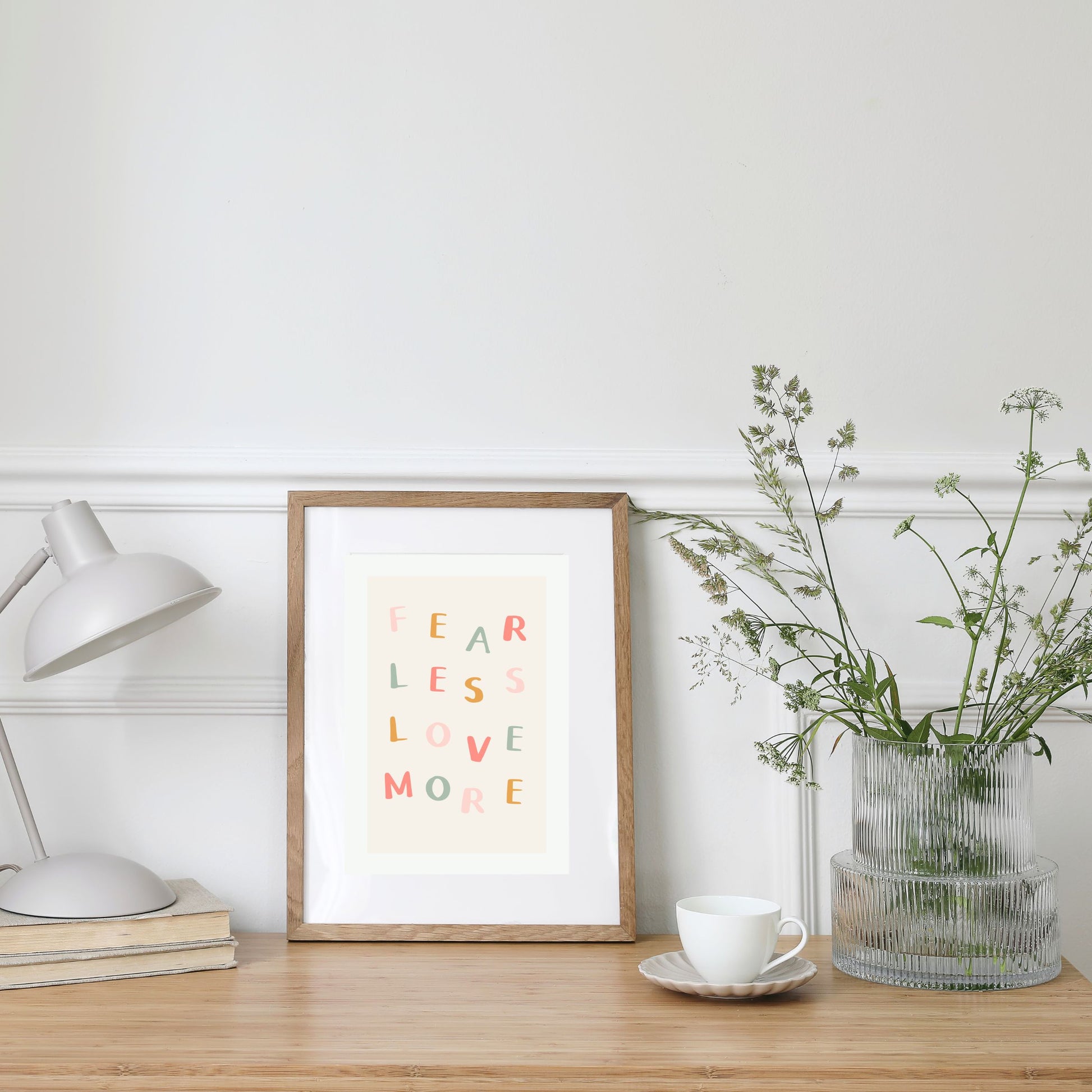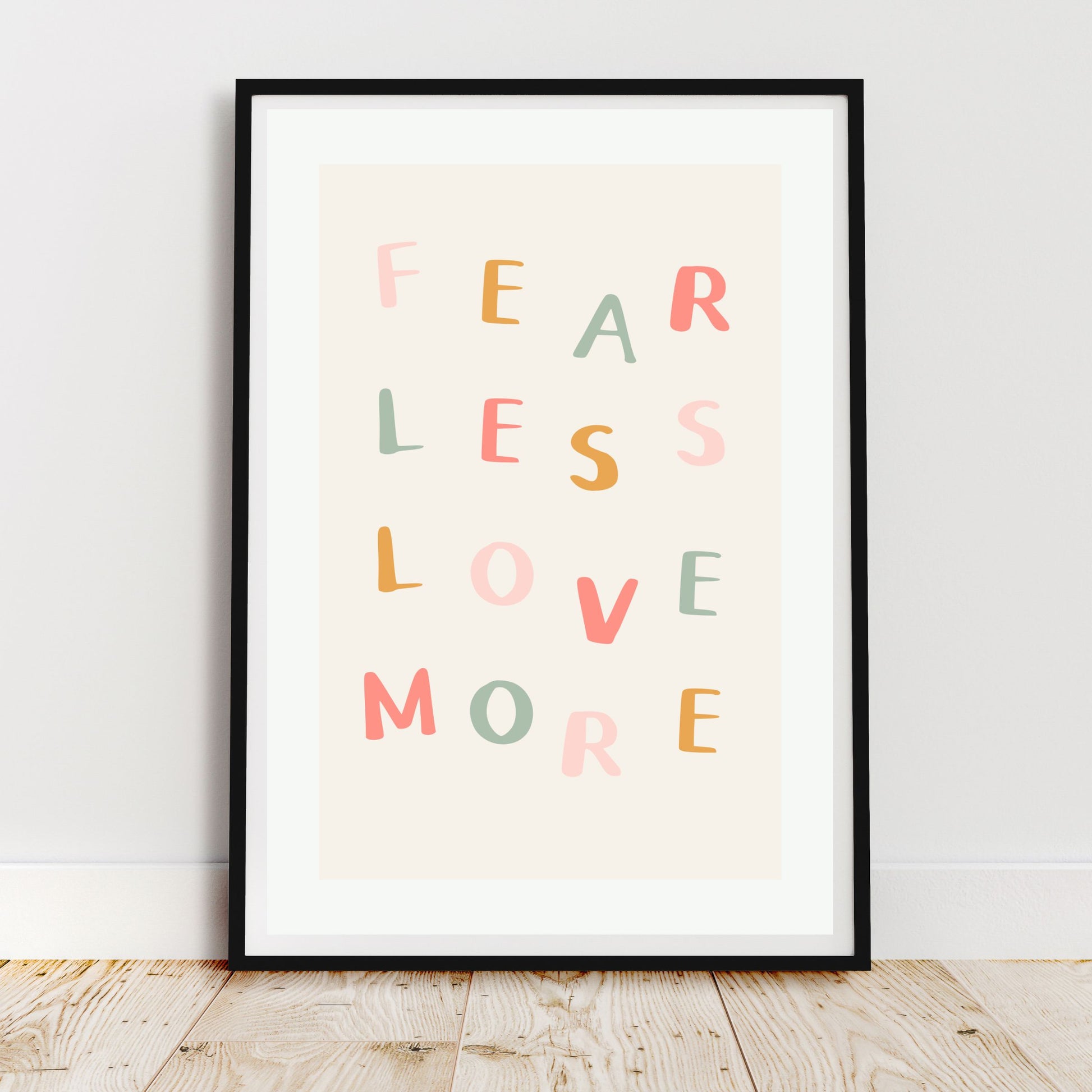 Featuring playful hand-lettered typography in a soothing pastel palette, the Fear Less Love More print is perfect for creating a calming, uplifting atmosphere at home, in a workspace, or as a thoughtful gift for someone who needs a little reminder of their own strength and courage.