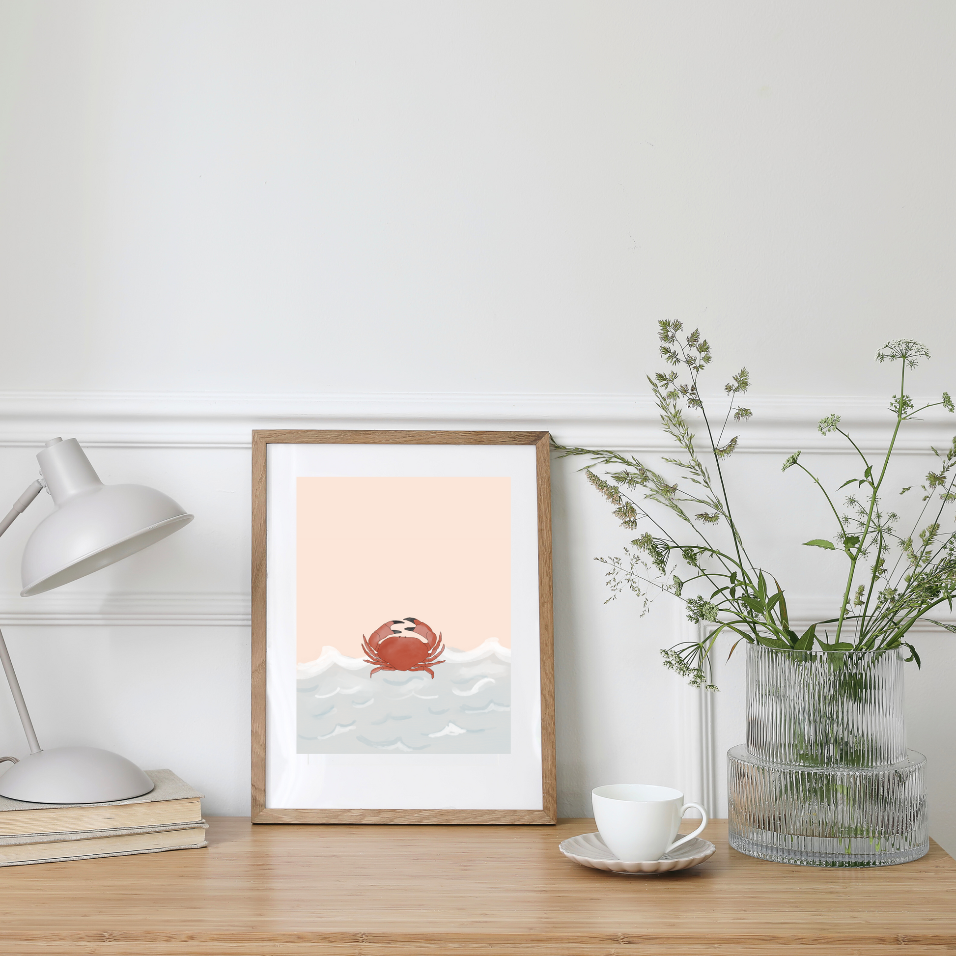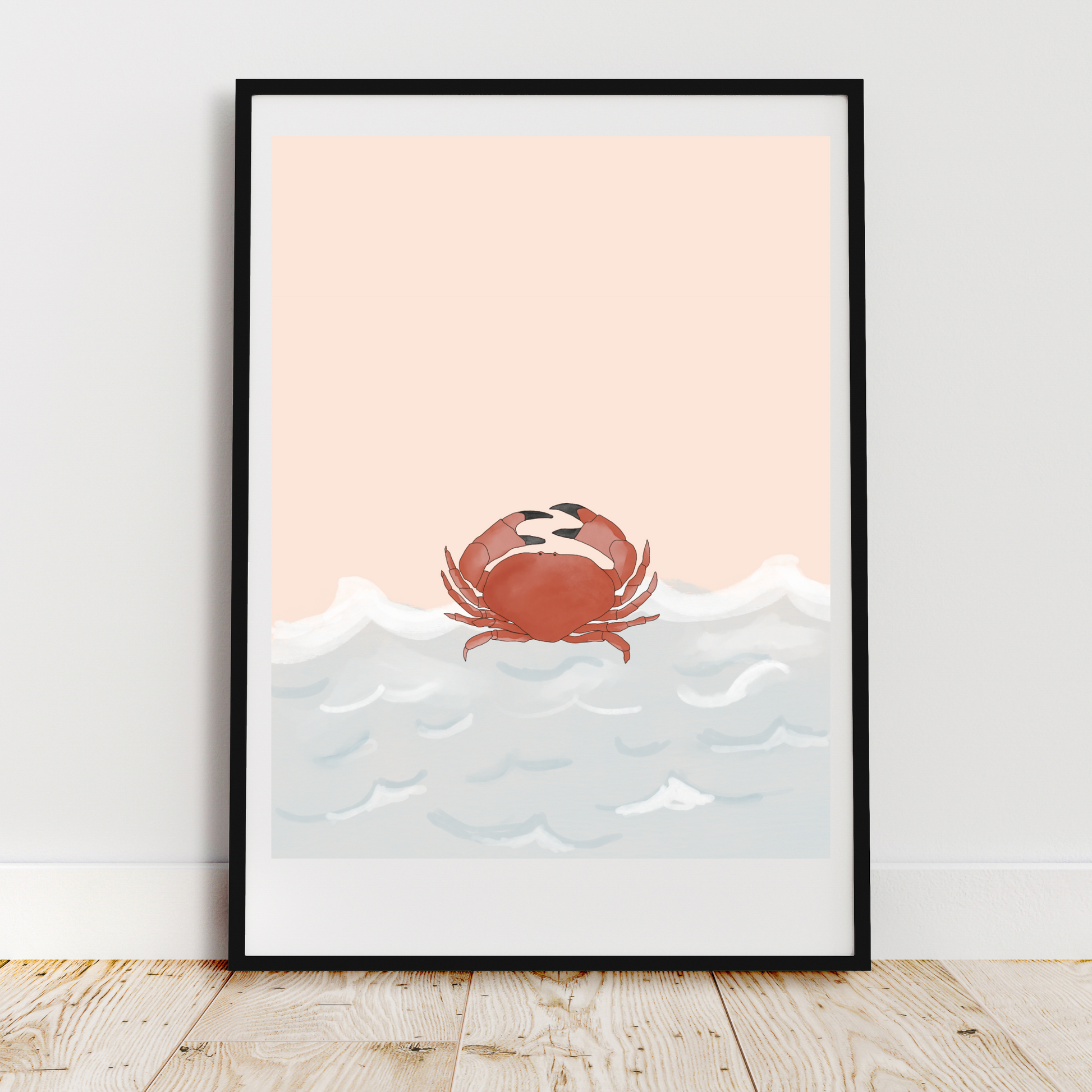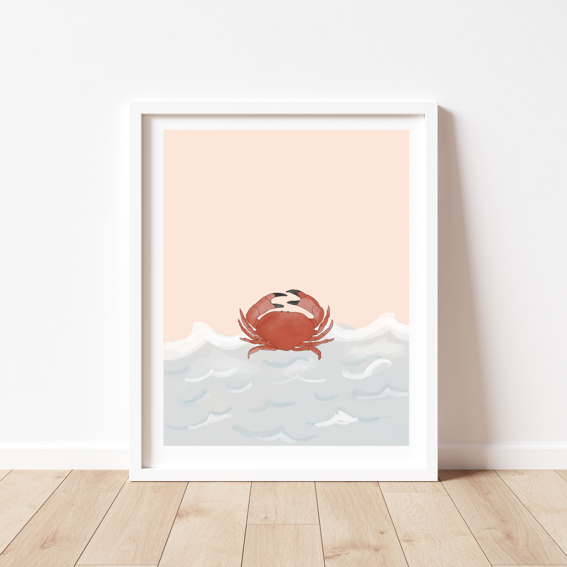 Bring a touch of whimsy and motivation to your space with our "Just Keep Swimming Crab Art Print." This charming illustration features a determined little crab navigating gentle ocean waves, reminding us all to keep moving forward, no matter what. The soft pastel background adds a calming coastal vibe, making it perfect for nurseries, bathrooms, or any room in need of a cheerful and encouraging accent. Printed on high-quality matte paper, this art print is available in multiple sizes to suit your decor needs.