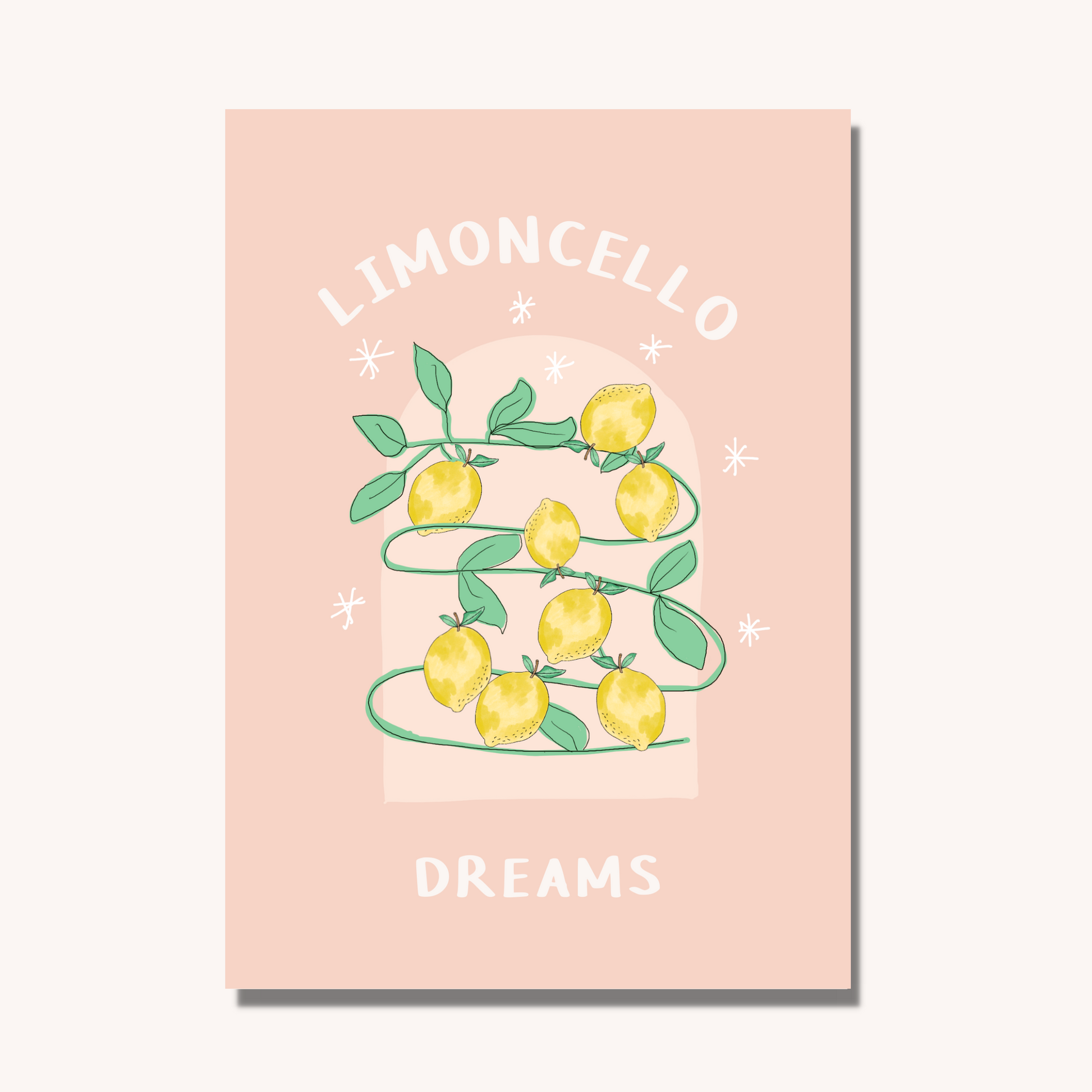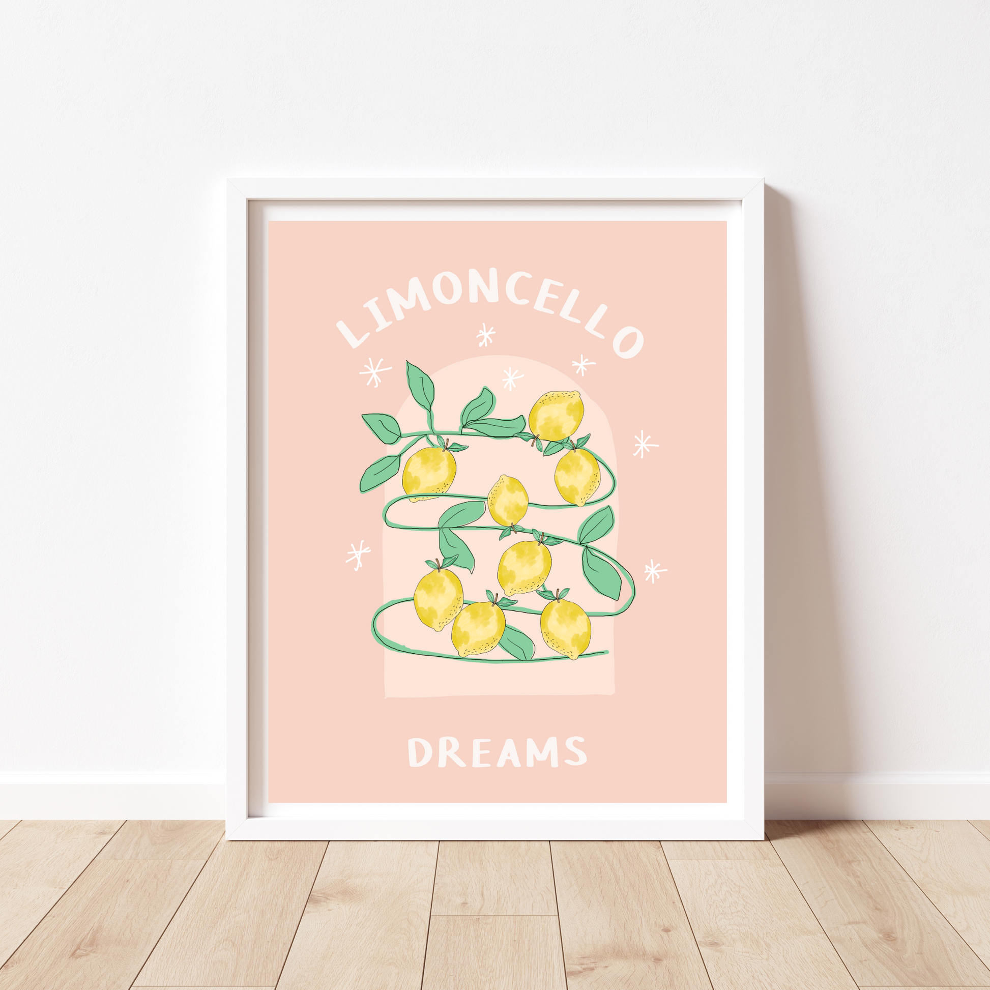Add a splash of Mediterranean charm to your space with the "Limoncello Dreams" art print collection. Featuring vibrant lemons set against a variety of pastel and earthy backgrounds, these prints evoke the sun-soaked beauty of Italy. Perfect for kitchens, dining rooms, or any area that needs a touch of brightness and warmth, these prints bring a bit of summer into your home all year round.